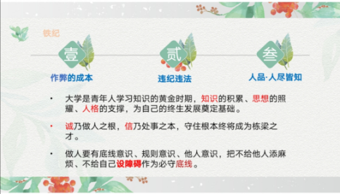 礼节,也是成年人的“必修课”之一。无论何时何地,都须注重仪容,镕陶行止。每一个招呼、每一声感谢、每一次理解,既给予了他人温暖,也升华了自身素养。作为学生,还应严守课堂纪律,保持宿舍卫生,杜绝考试作弊。诚乃做人之根,信乃处事之本,守住根本,终成桢干。