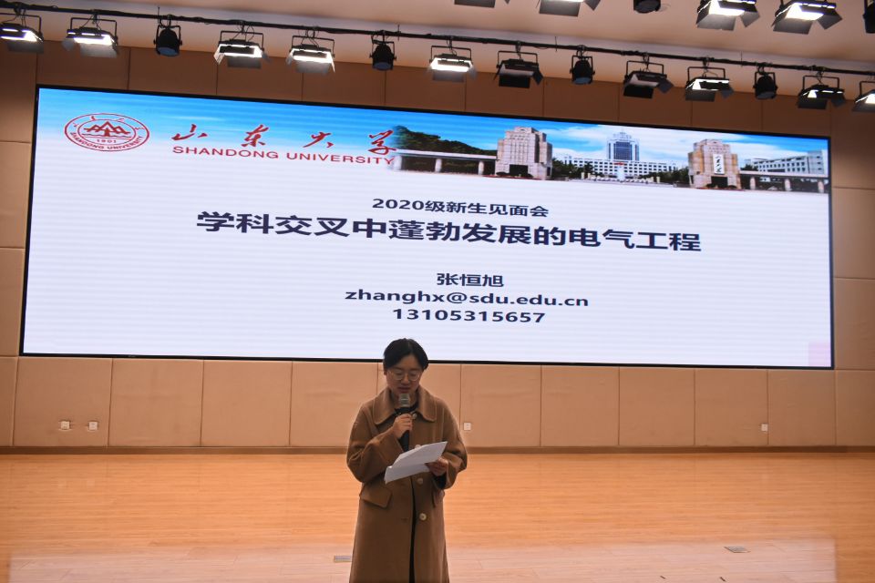 邱瑶先从科研及教学两个方面向20级新生介绍张恒旭院长取得的突出成果。讲座开始后,张恒旭则围绕“为什么”“学什么”“做什么”三个问题向学生详细介绍了学科交叉中蓬勃发展的电气工程专业。