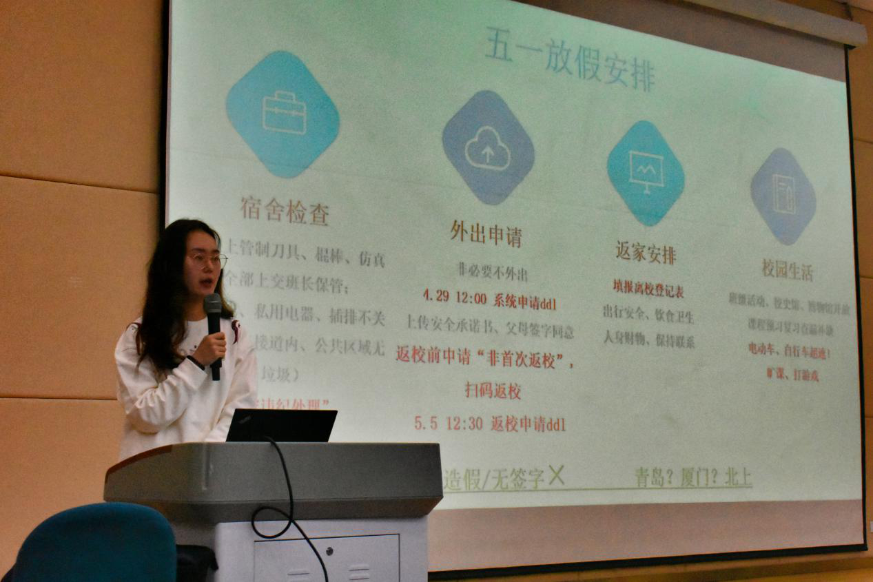 “五一”国际劳动节假期临近,刘欣首先讲述了放假事项的具体安排。刘欣指出,当前疫情防控形势依然严峻复杂,学生仍要坚持“非必要不外出”的原则;返乡学生需配合学院的相关审核要求,做好材料的准备与提交工作;留校学生则应服从学校管理,并利用假期预习、复习,查漏补缺,积极参与班级活动,参观校史馆、博物馆等文化场所,丰富课余生活。