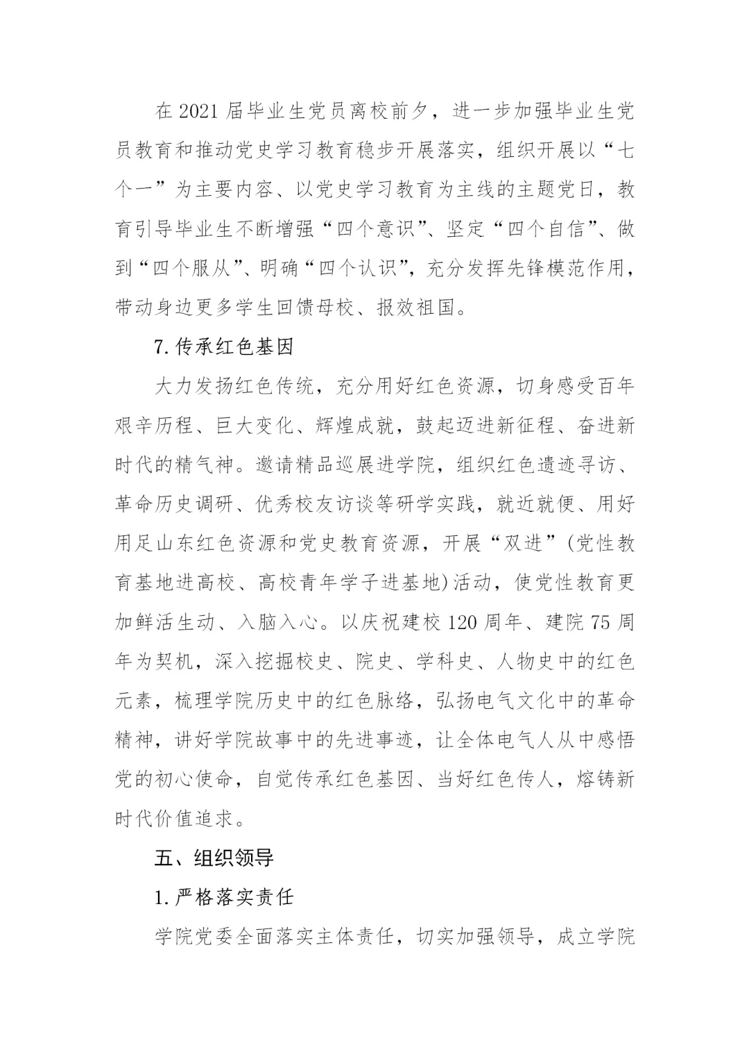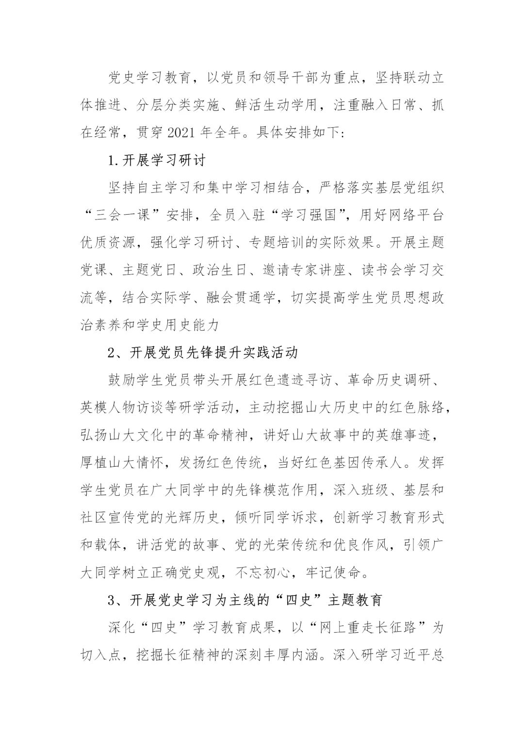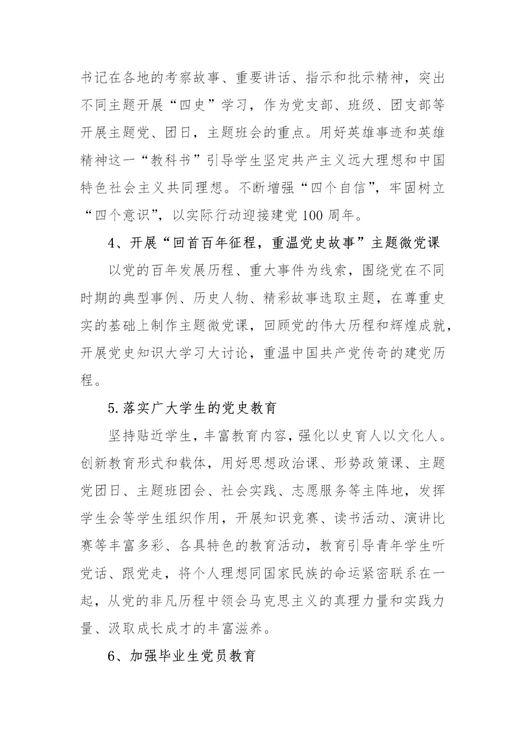 3月14日,学校发布《“重走百年‘长征路’”学生党史学习教育方案》,科学指导学生开展党史学习教育。《方案》采取学校整体方案引导、学院形式创新的模式,结合大学生学习生活特点,融贯学、赛、讲等,线上线下有机结合,从十一个方面对学生党史学习教育进行科学系统的指导。用好“学习强国”“灯塔—党建在线”等网络平台优质党史教育资源,以党史学习教育为主线深入开展“四史”教育,充分利用好百廿山大校史资源,探索科学学习党史的方法路径,创新发展切实有效的学习教育形式,调动学生主动参与和自主学习的积极性。