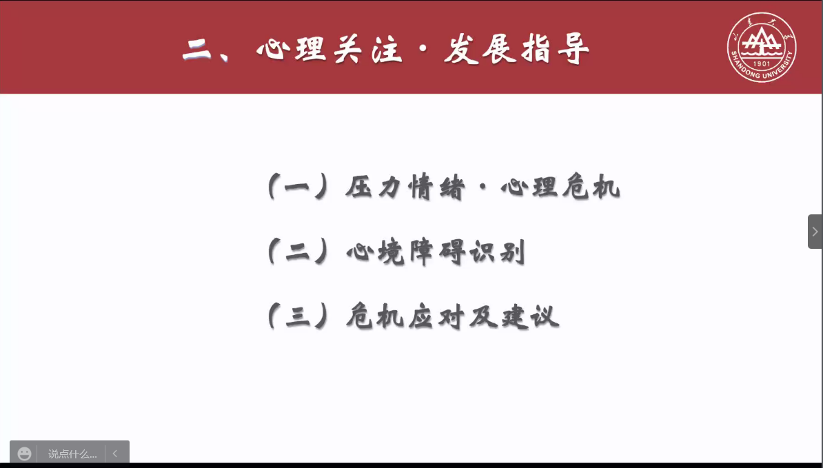 针对当前高校学生的情绪、心理变化情况,刘欣以“心理关注·发展指导”为主题向家讲解工科大学生在校学习生活中存在的压力情绪。她指出,19级学生正在面临考研保研就业等方向选择问题,存在一定的压力,希望家长理解学生的各种情绪并给予支持与指导。刘欣从心境障碍识别到心理危机应对讲述了重要的危机信号识别。结合心理知识与案例,她从倾听孩子、表达理解、鼓励宣泄、引领思考、风险评估五方面对家长提出建议。