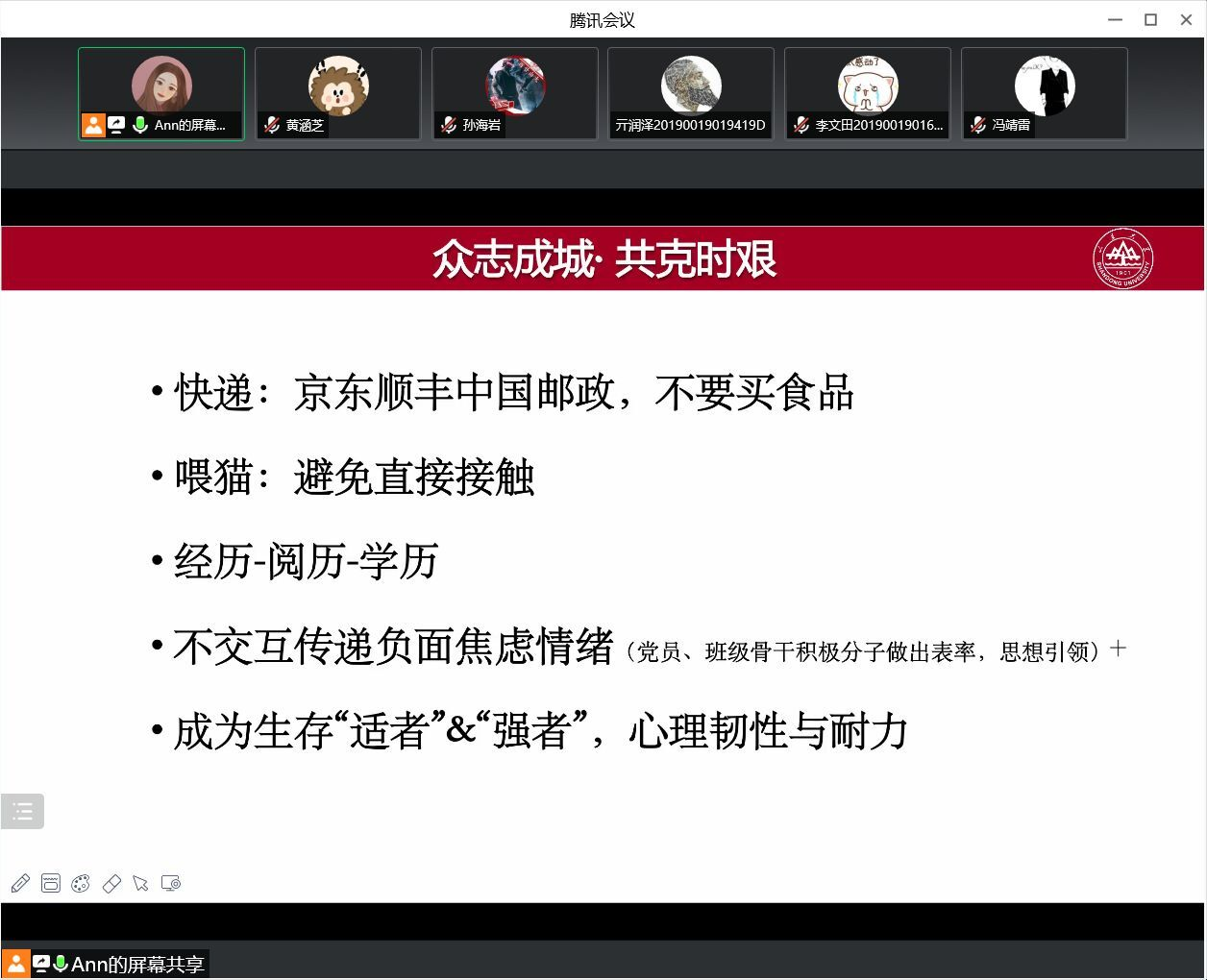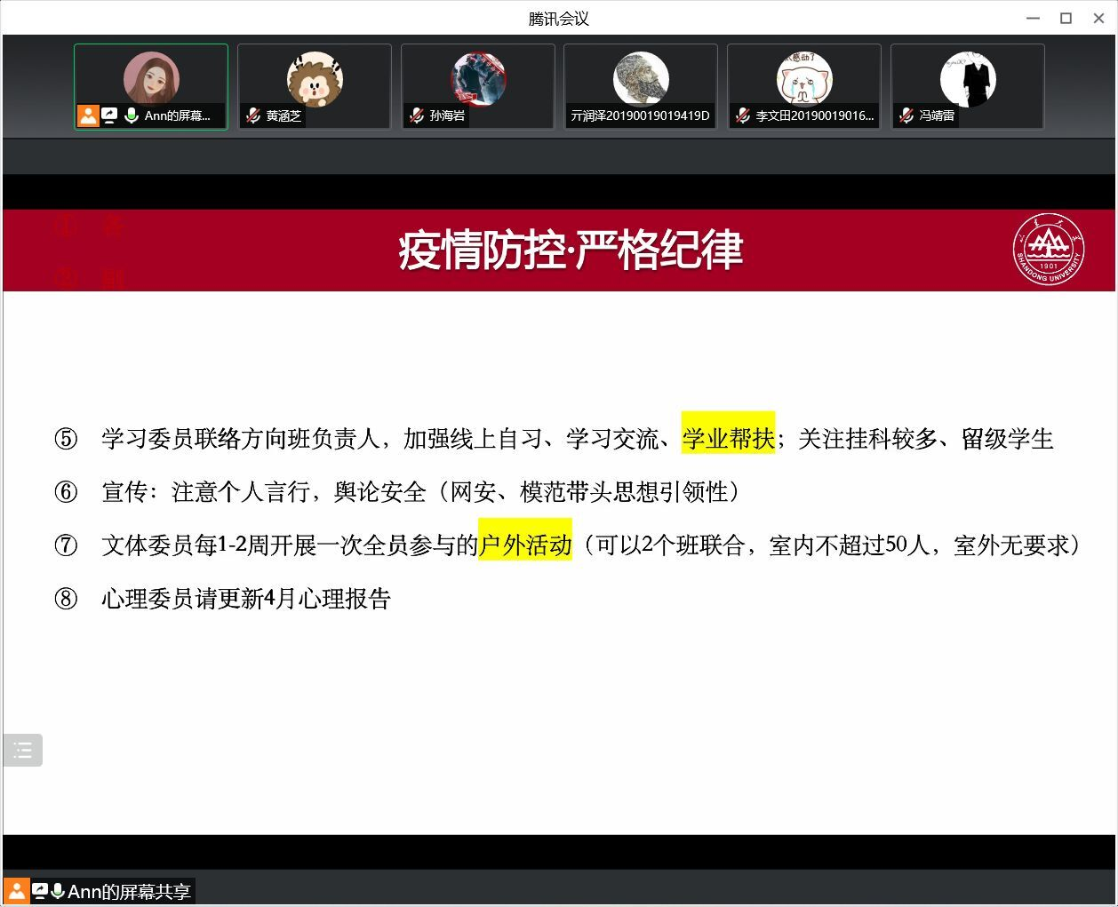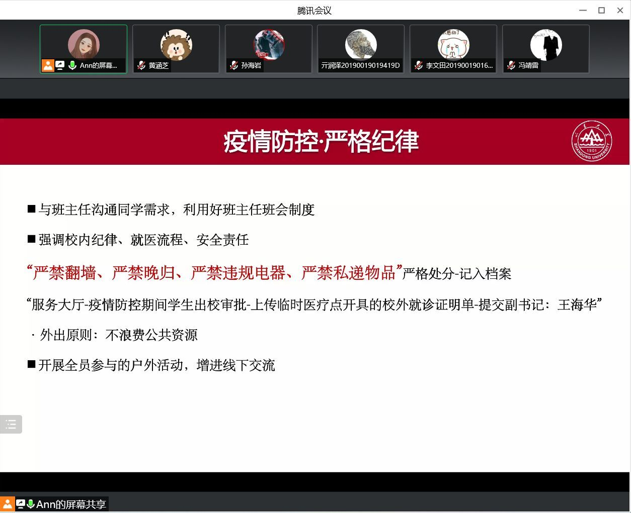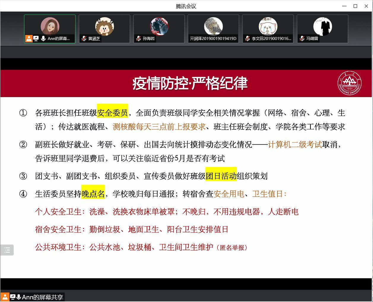 本次线上会议旨在强调疫情防控的纪律要求,督促各班委和党团骨干做好表率作用,在疫情防控期间团结同学、众志成城、共克时艰,及时发现并帮助同学们解决学习和生活中的困难,共筑良好的学习生活氛围,为打赢疫情防控阻击战奠定坚实基础。