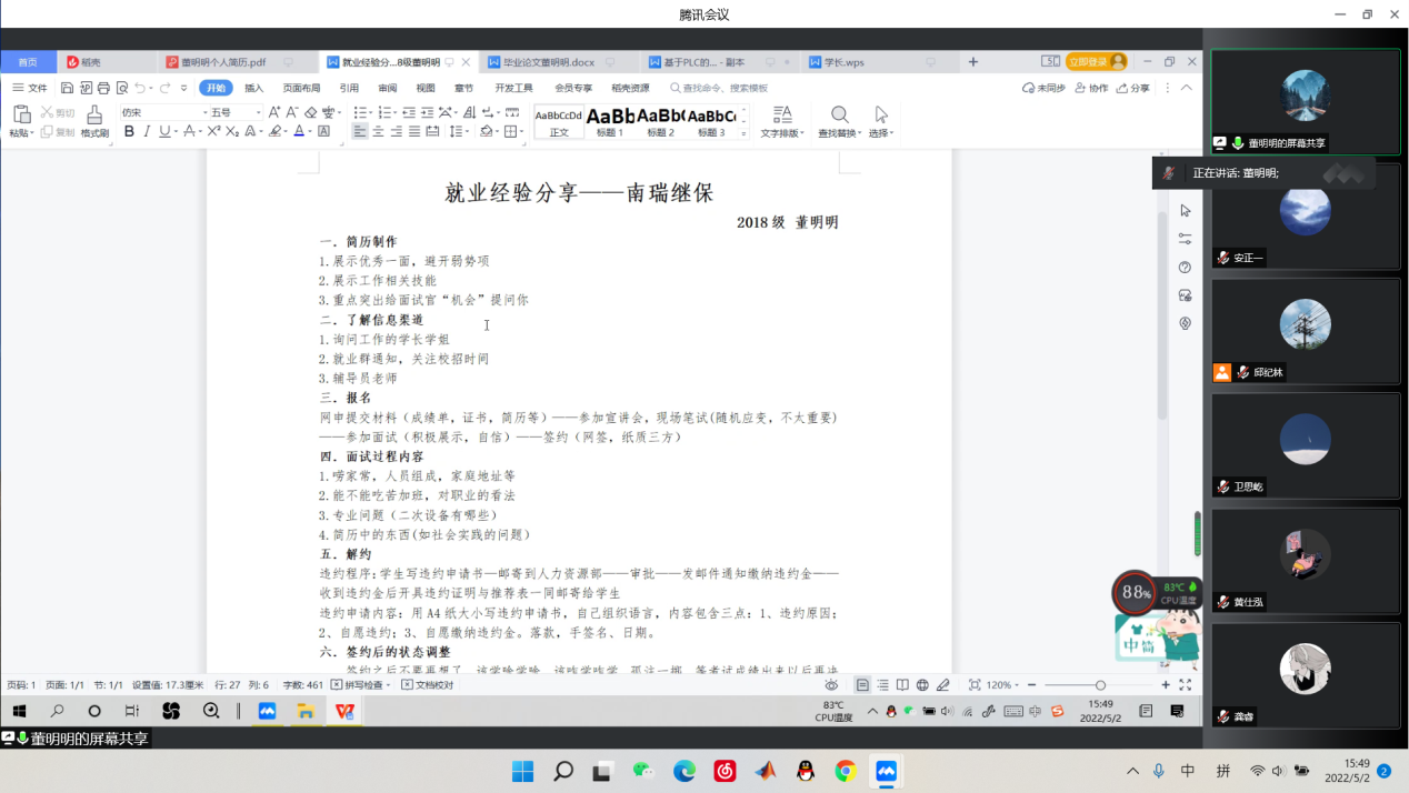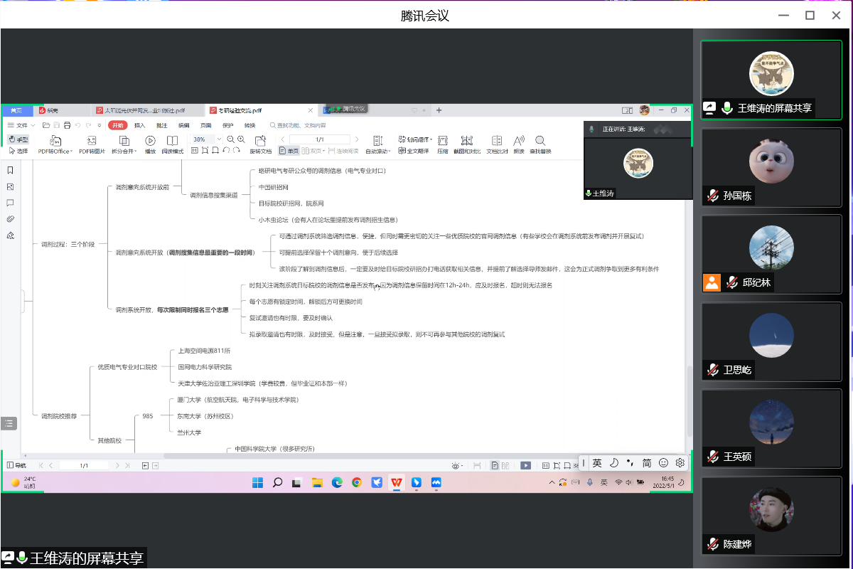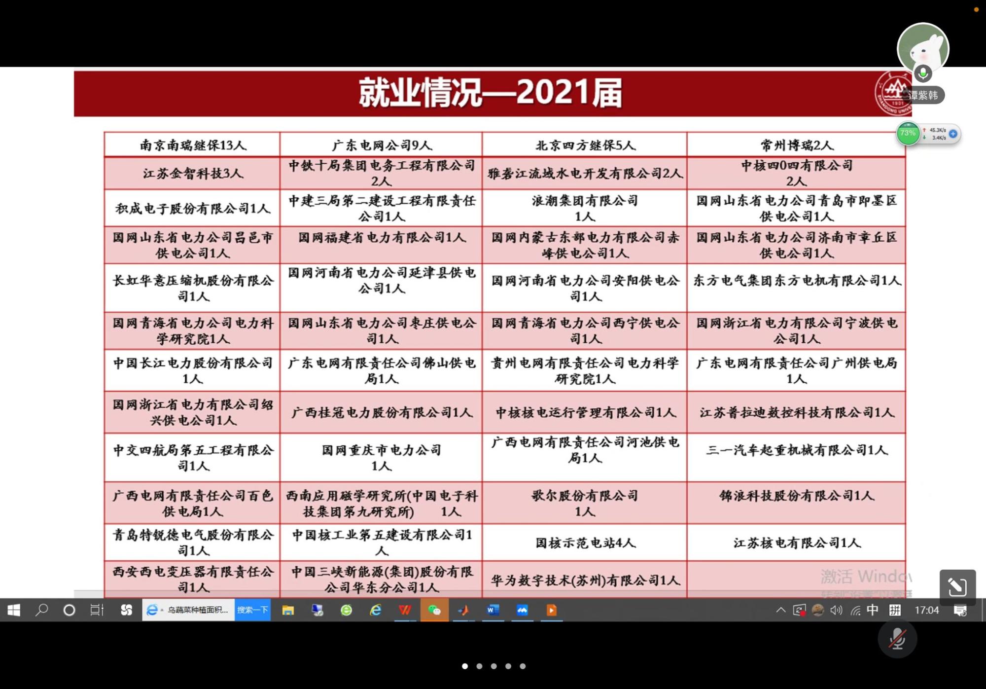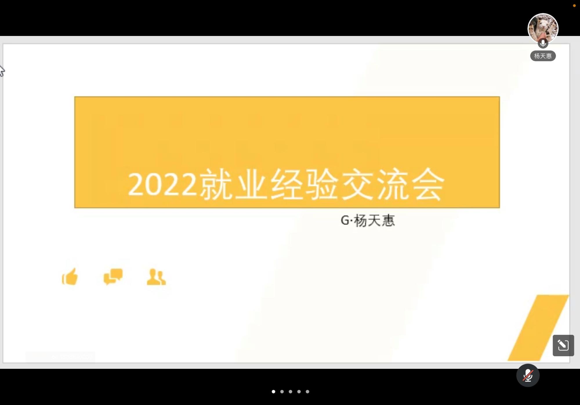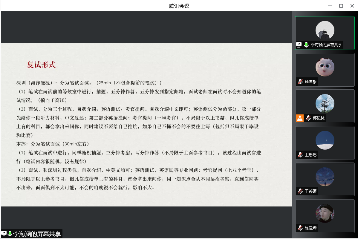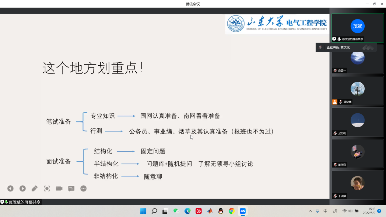 5月2日,学院举办线上就业经验交流会,邀请到曹茂斌、丁洁婷、董明明、黄仕泓、刘尊龙、杨天惠、于瑶、谭紫韩等顺利就业的党员学生为参会同学答疑解惑。丁洁婷、董明明、杨天惠、于瑶用word文档、幻灯片等丰富多样的方式配上详细的讲解,直观呈现从制作简历到参加面试的全过程、结构化面试的考场布置,从面试简历制作、自身心路历程、应试技巧及注意事项等方面与同学们分享面试经验,建议在简历上简洁明朗地展现个人信息,认清自身特点,放松心态、积极应答,充分向面试官展现优点。曹茂斌、黄仕泓、刘尊龙、谭紫韩四位学子则从不同方向分享了自身与就业相关的经验:结合近年实际情况分析就业单位和就业趋势,引导同学们在考研与就业之间作出正确选择;根据招考大纲推荐各科目教材,结合自身实际感受分享国网考试经验;成功就业不是终点,应继续学习专业知识谋求长远发展。会议结束,八位分享者留下了联系方式,为进一步深入交流提供有效途径。