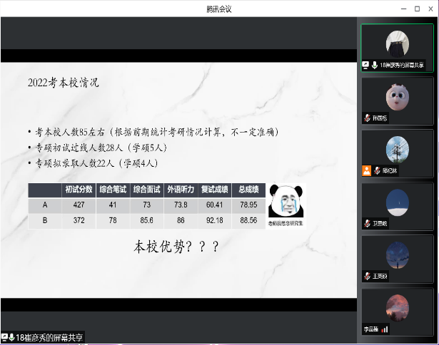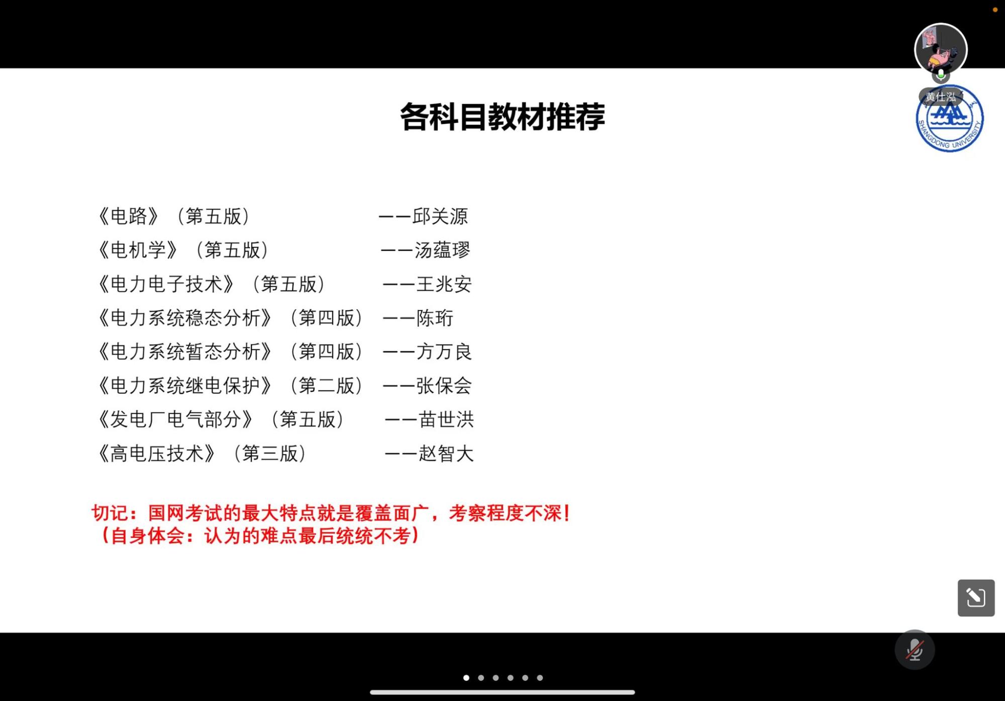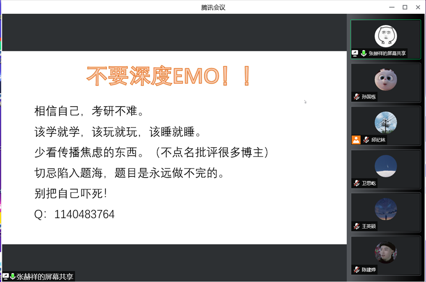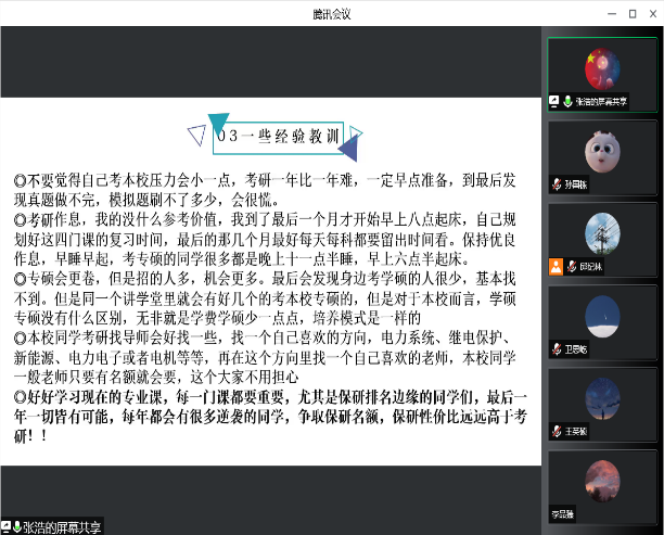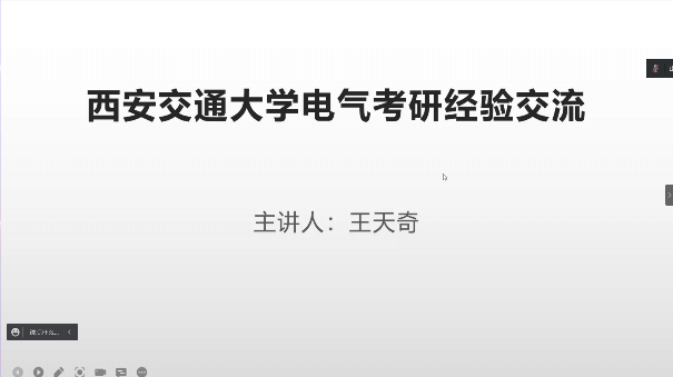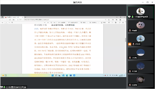 5月1日,学院举办线上考研经验交流会,王天奇、公泓鑫、李海涵、王维涛、张赫祥、李致华、崔彦秀、张浩等党员学子分享自身的考研经历和宝贵经验,并就相关注意事项和本专业的考研方向进行详尽介绍。从院校分析、院校复试、专硕考研形势到各科目基本情况及复习流程、初复试注意事项,八位学子的分享各有特色,分别从不同侧重点详尽介绍了考研科目的具体规划及考研的未来趋势,建议即将考研的同学们在备考前确立目标院校,明确考试科目及内容,熟悉考研复习的基本准备流程,拟定针对性的复习计划,学会科学复习、合理安排时间、不囿于题海,同时鼓励参会同学珍惜本科阶段的学习时光,坚定信心、不懈拼搏,力争保研。交流会强调,心态调整是决定考研能否成功的重要环节,应减少接收负面信息,停止传播焦虑情绪,以自信心态拥抱全新未来,学会合理释放心理压力、及时调适学习状态;面对失败要不气馁不放弃,以奋斗精神和向上心态迎接挑战,积极把握每一次机会。会议最后,党员分享者们表达了对全体电气学子一战成硕的祝福。