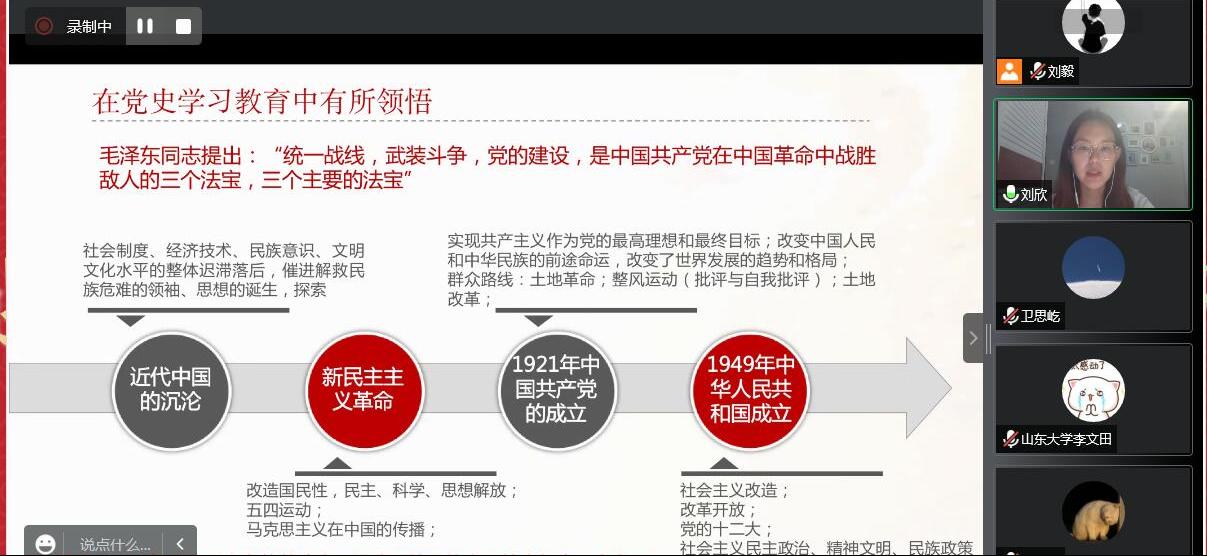 会上,刘欣总结梳理党史学习教育过程和学习心得,指出“要在党史学习中有所领悟、获取精神财富”,号召党员们通过对党史的深刻学习提高思想觉悟、端正入党动机、不忘入党初心。她结合当下国内外形势,强调国家从严治党的必要性,重申党组织对学生党员的严肃要求,并对新学期党员纳新、转正、支委选举等党支部工作作出简要安排。