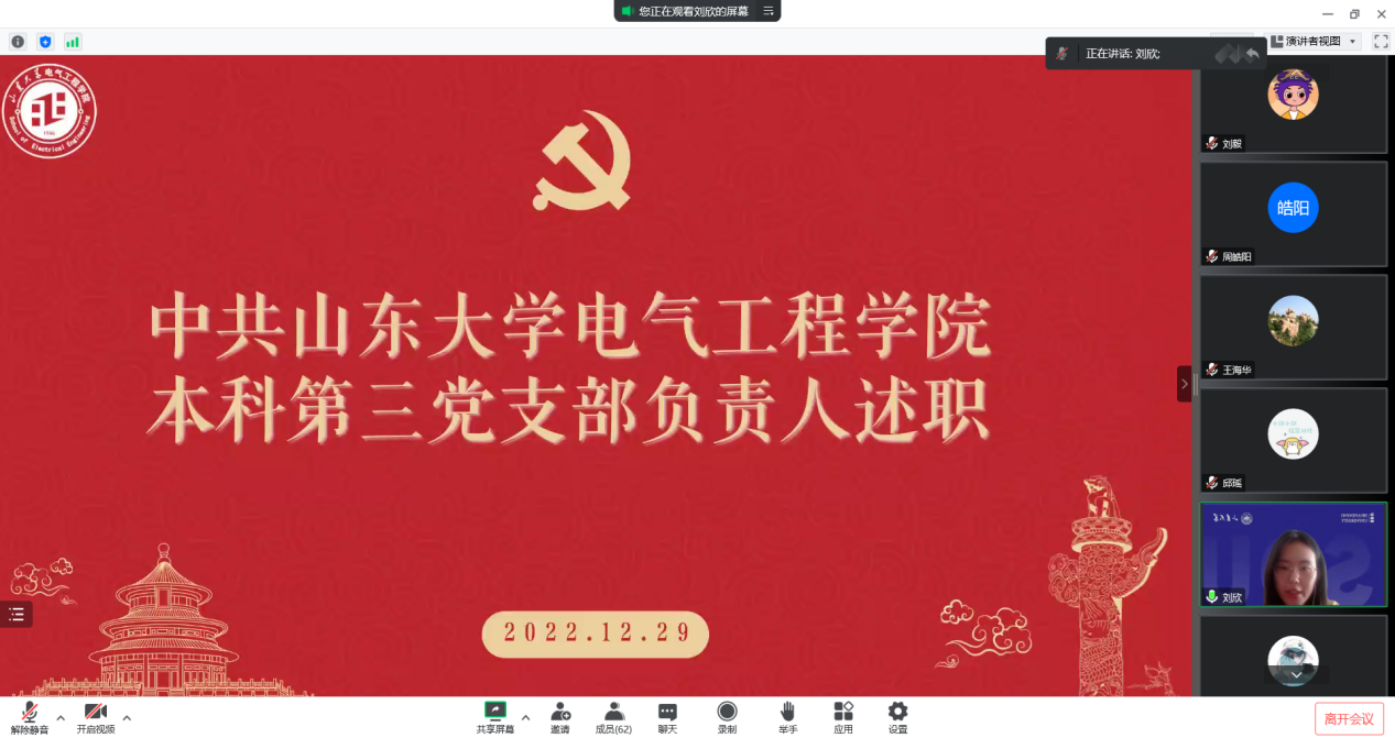 最后,刘欣代表本科第三党支部进行述职。围绕支部基本情况、履行全面从严治党责任、基层党建工作、存在问题、问题整改措施及2023年工作思路五方面内容总结了本年度支部工作成果和下一步工作计划,本科第三党支部将“不忘初心、牢记使命”作为支部系列会议和活动贯穿始终的重要内容,推进“互联网+党建”工作,落实压紧灯塔“e支部”纪实党建活动,完成“党建引领,电驾齐驱”学业帮扶立项,支部党员积极投身各年级学业帮扶工作中,以一对一、多对一的形式开展对三困学生在学习、思想、生活上的帮扶,充分发挥朋辈帮扶引导作用。