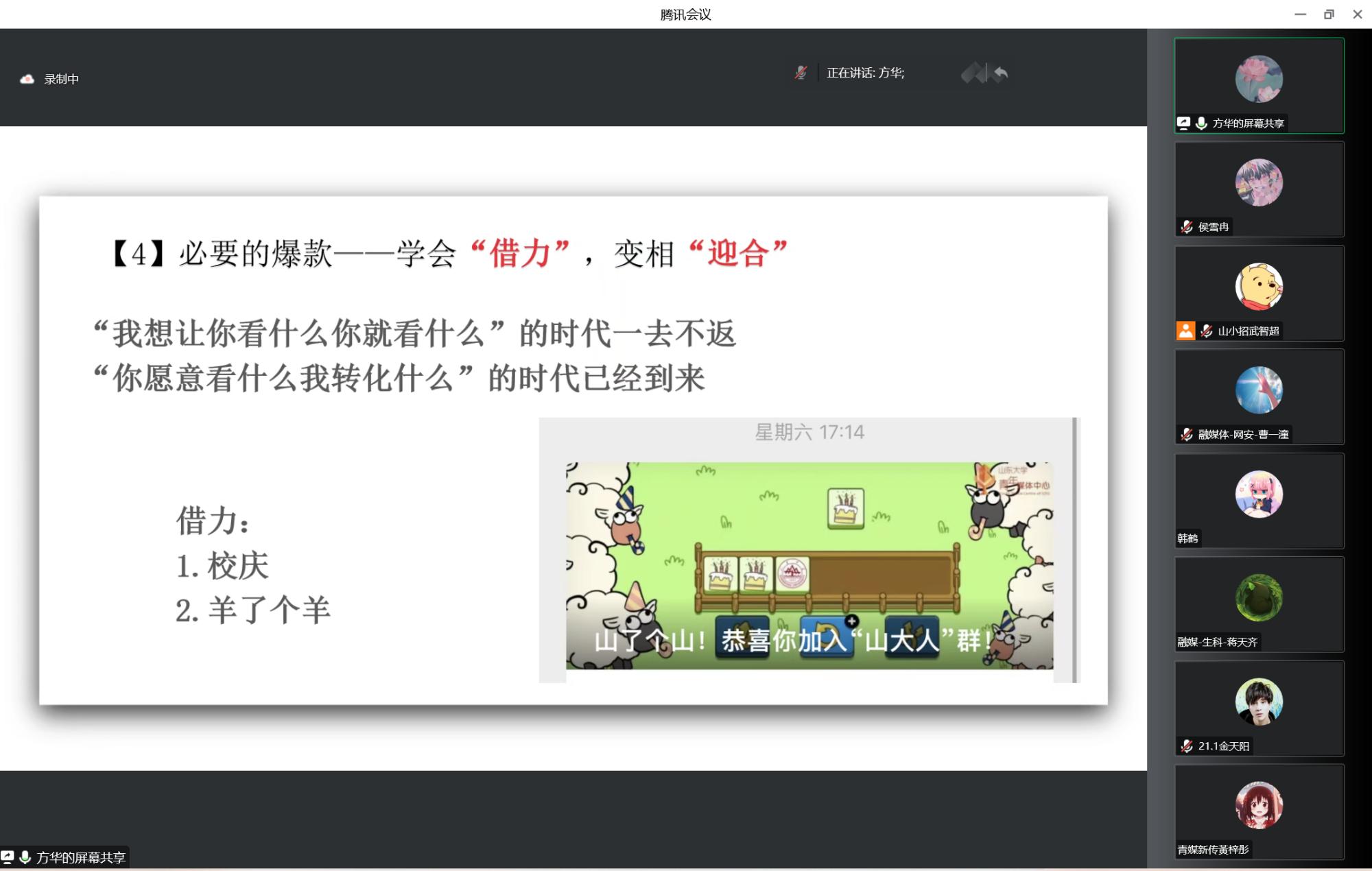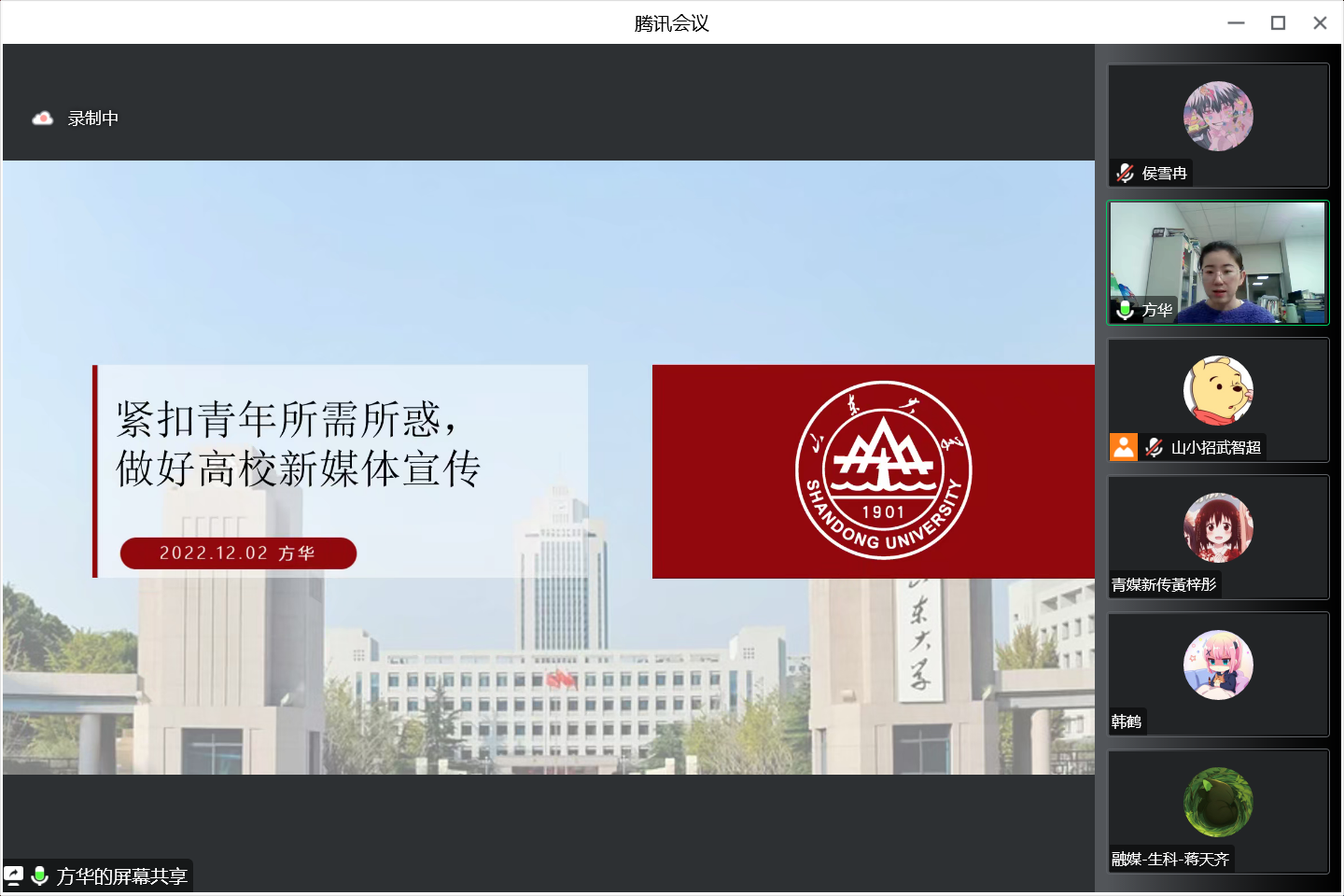 为倡导青年宣传骨干扎实基础能力,做好山大新媒体宣传工作,12月2日晚7点,新葡的京集团35222vip组织各年级宣传骨干线上参加新葡的京集团35222vip青年媒体菁英能力提升计划第九期课程。本次培训由《青年新媒体运营实务》课程负责教师方华主讲。主题为“紧扣青年所需所惑,做好高校新媒体宣传”。
