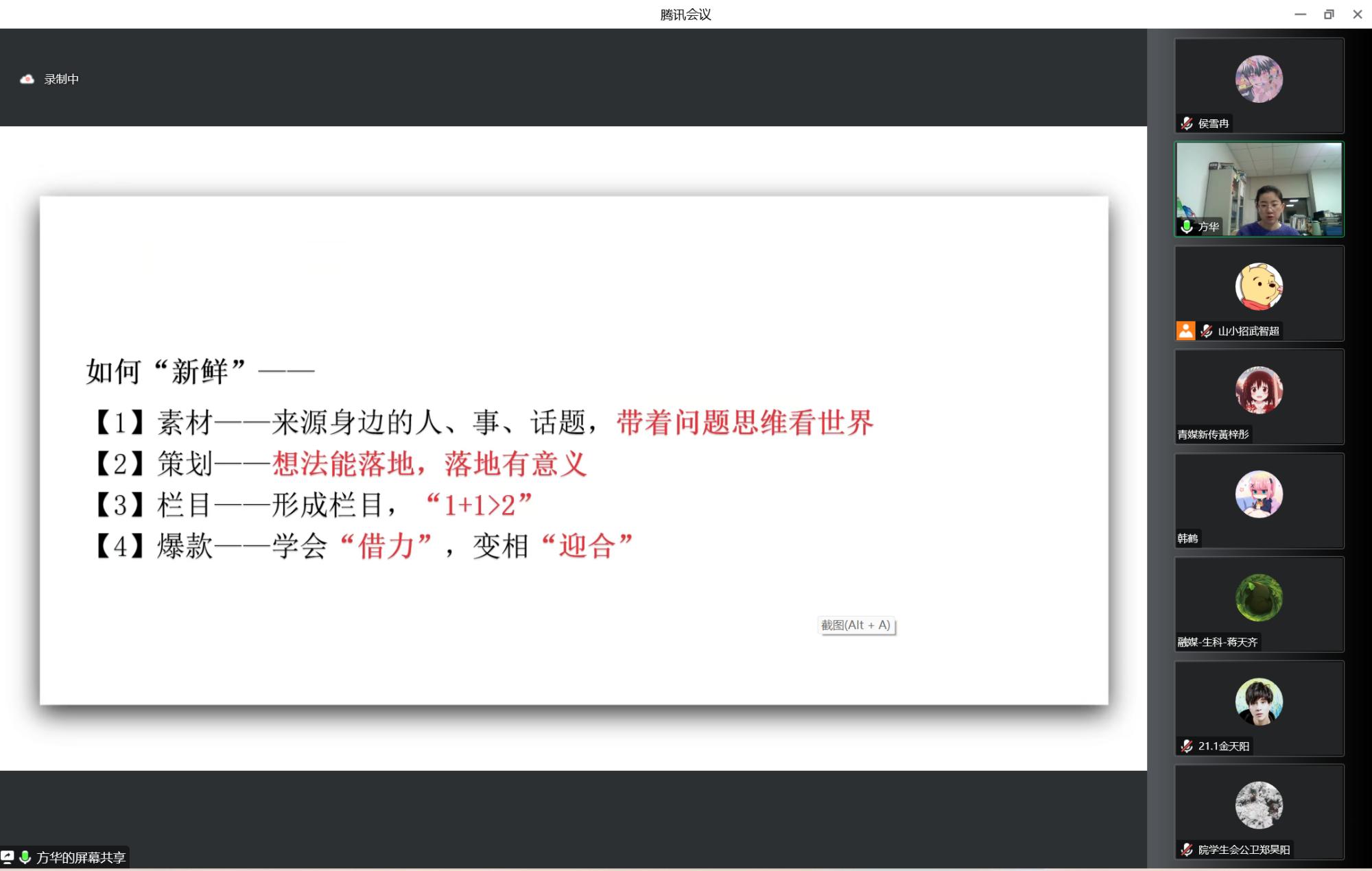 会议伊始,方华一语点明校园媒体和社会新闻的区别,针对校园宣传工作特殊性及其导向展开了深入讲解。她提出,校园宣传工作的定位导向是服务于青年用户,依据青年所需所惑而展开工作,在自媒体爆炸的时代背景下,我们无时无刻不被“宣传”裹挟,宣传工作的门槛降低,但要求却不断提高,我们不是每个人都是记者,但每个人都是“新闻人”;另一方面,当今时代下宣传工作不再只是记者的专场,而是每个人都应具备的能力,是踏入社会的必修课。