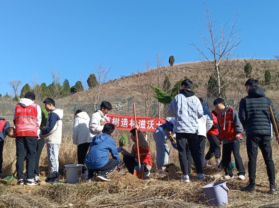 3月12日上午,各位志愿者抵达活动现场,植树活动正式开展。志愿者们用铁锹、锄头、铁镐等工具挖好植树土坑,清理土坑中的碎石块,为小树苗的生长提供足够且良好的生存空间。同学们将小树苗植于坑中,有序填埋土壤,围堆石块,保证小树扎根生长期间挺直抗倒伏。以上工作完成后,各位志愿者用分发的丝带装饰小树苗。2022级辅导员刘德硕与2020级辅导员邱瑶对此次活动的重要意义作出充分肯定,并与同学们一起为小树浇水,在卡片上提笔写下对小树的真情祝愿。随后,活动参与人员在植树现场集体合影留念。