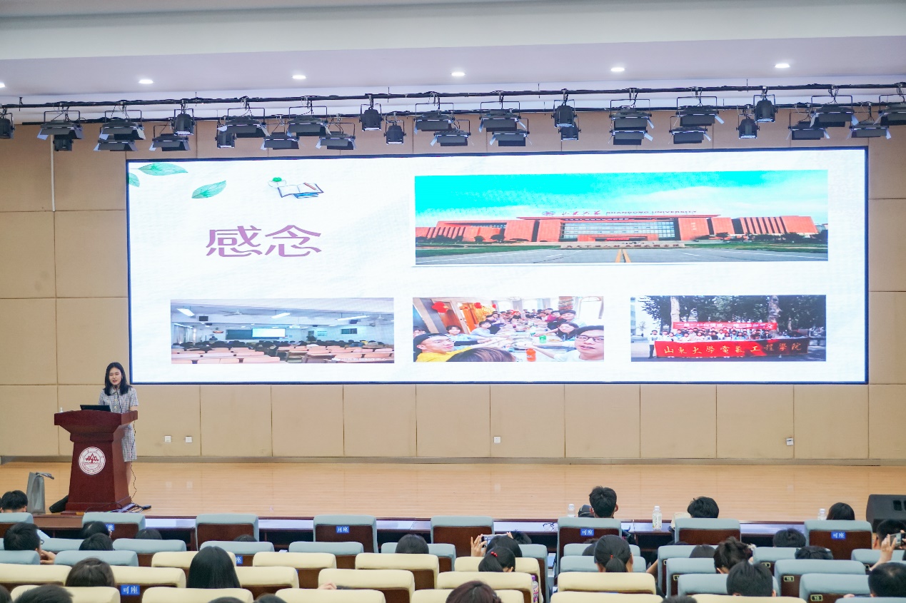 会议上,刘欣赠予2019级全体学生写有毕业祝福的明信片,寄语同学们"爱你所爱,乘风好去,万水千山,无限精彩"。小小的卡片寄托着辅导员对同学们的无限期望,由衷的嘱托为精彩的四年生活画上完美句号。